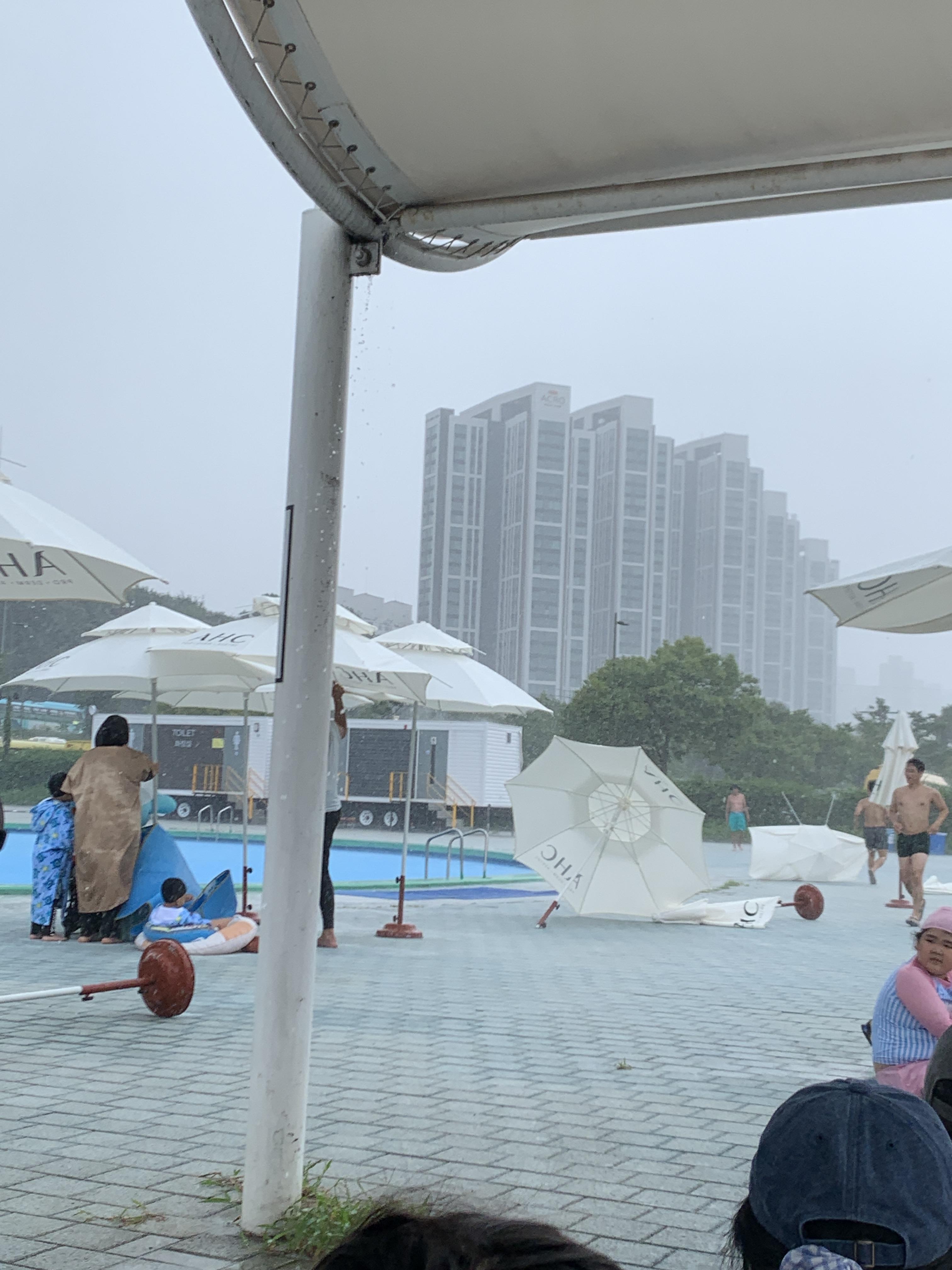 먹구름이 몰려오더니 몰아치는 비바람에 처참해진 파라솔...